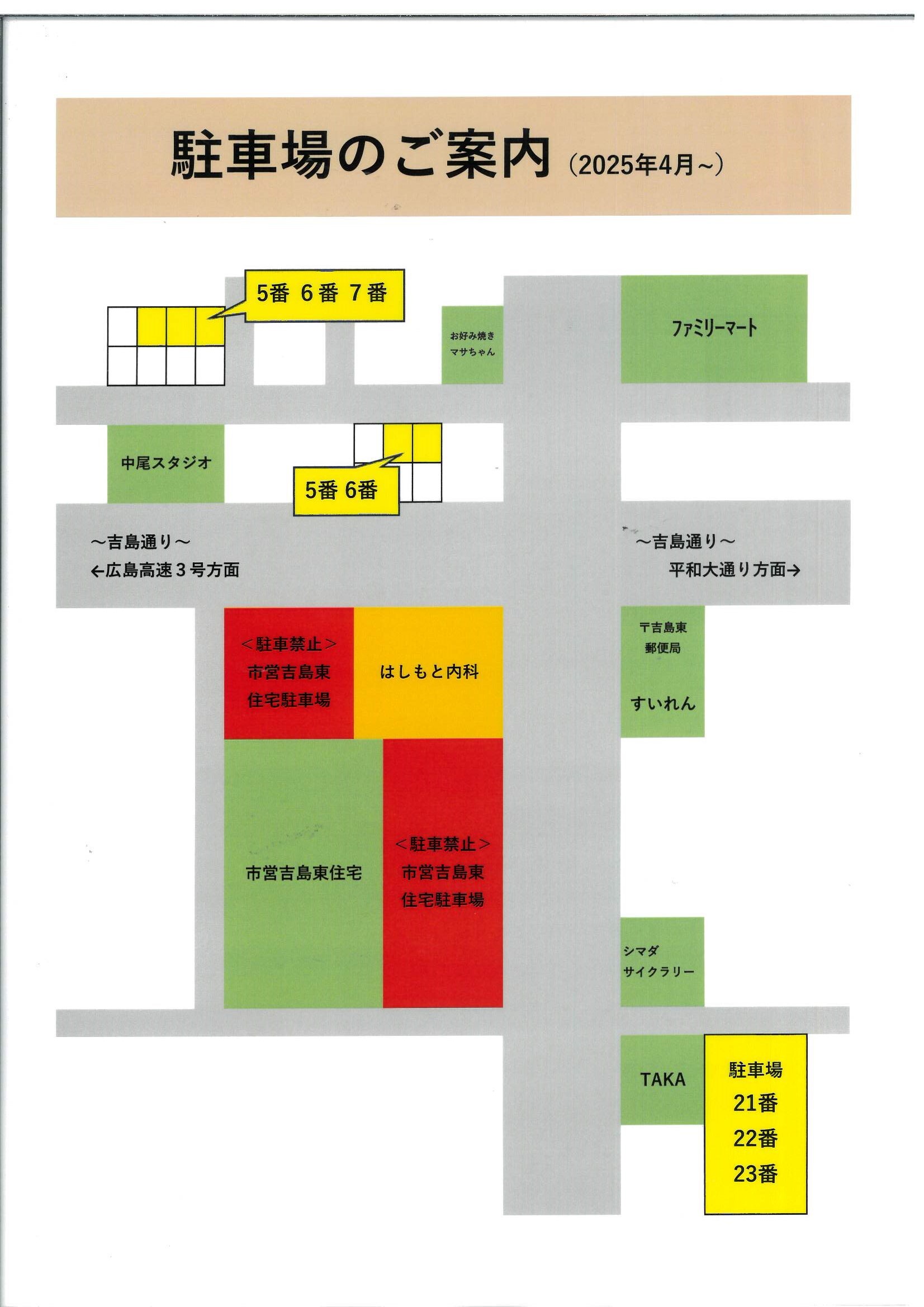 駐車不可のところは市営吉島東住宅の駐車場ですので、駐車は厳禁でお願い致します。